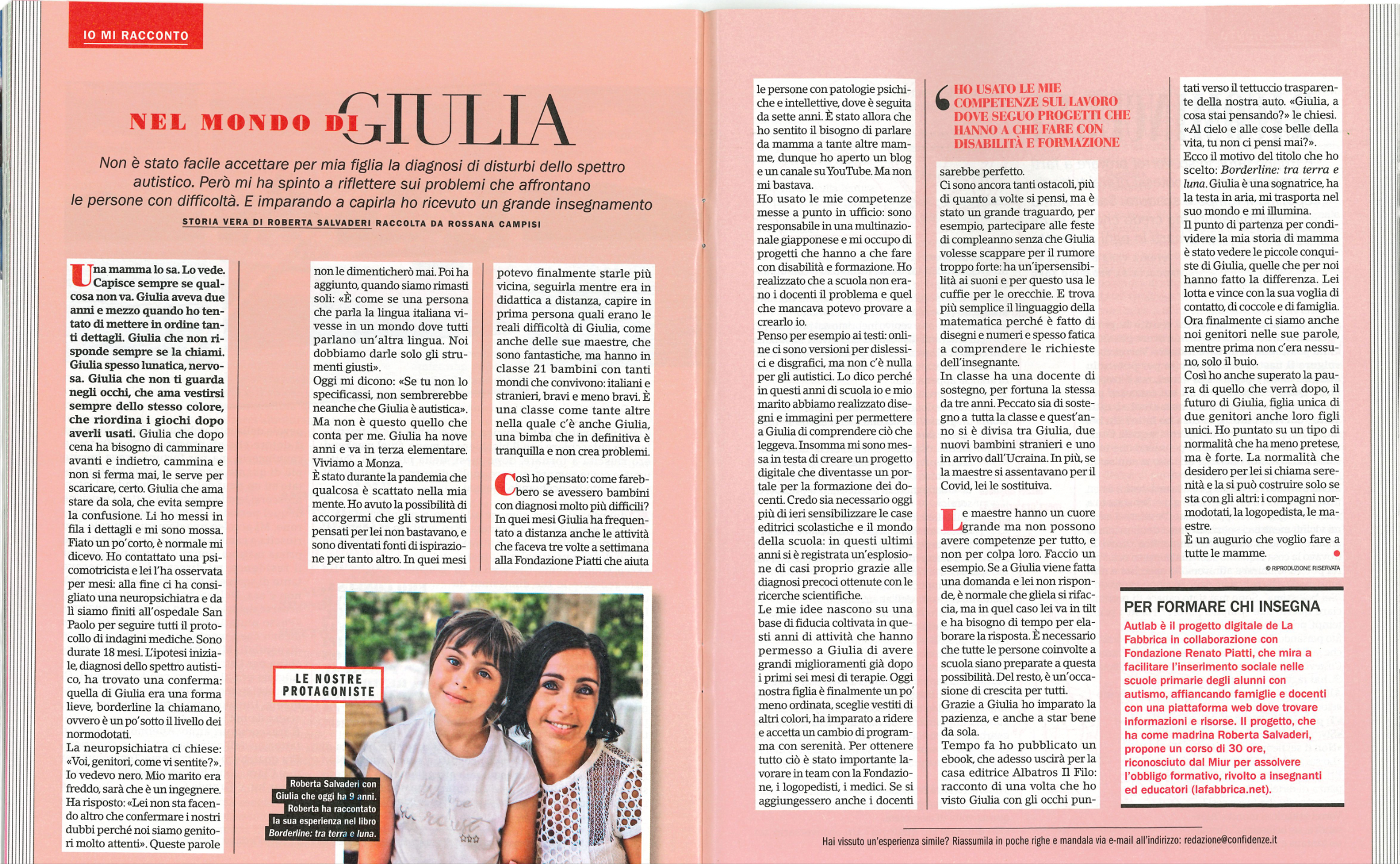 “Blogger e mamma di Giulia, Roberta Salvaderi trasmette positività ed energia. È ideatrice di “Autlab: laboratorio per menti speciali”, autrice del libro “Borderline: tra Terra e Luna” e promotrice della Fondazione Tra Terra e Luna che ha l’obiettivo di informare, formare e diffondere contenuti sullo Spettro Autistico.”...