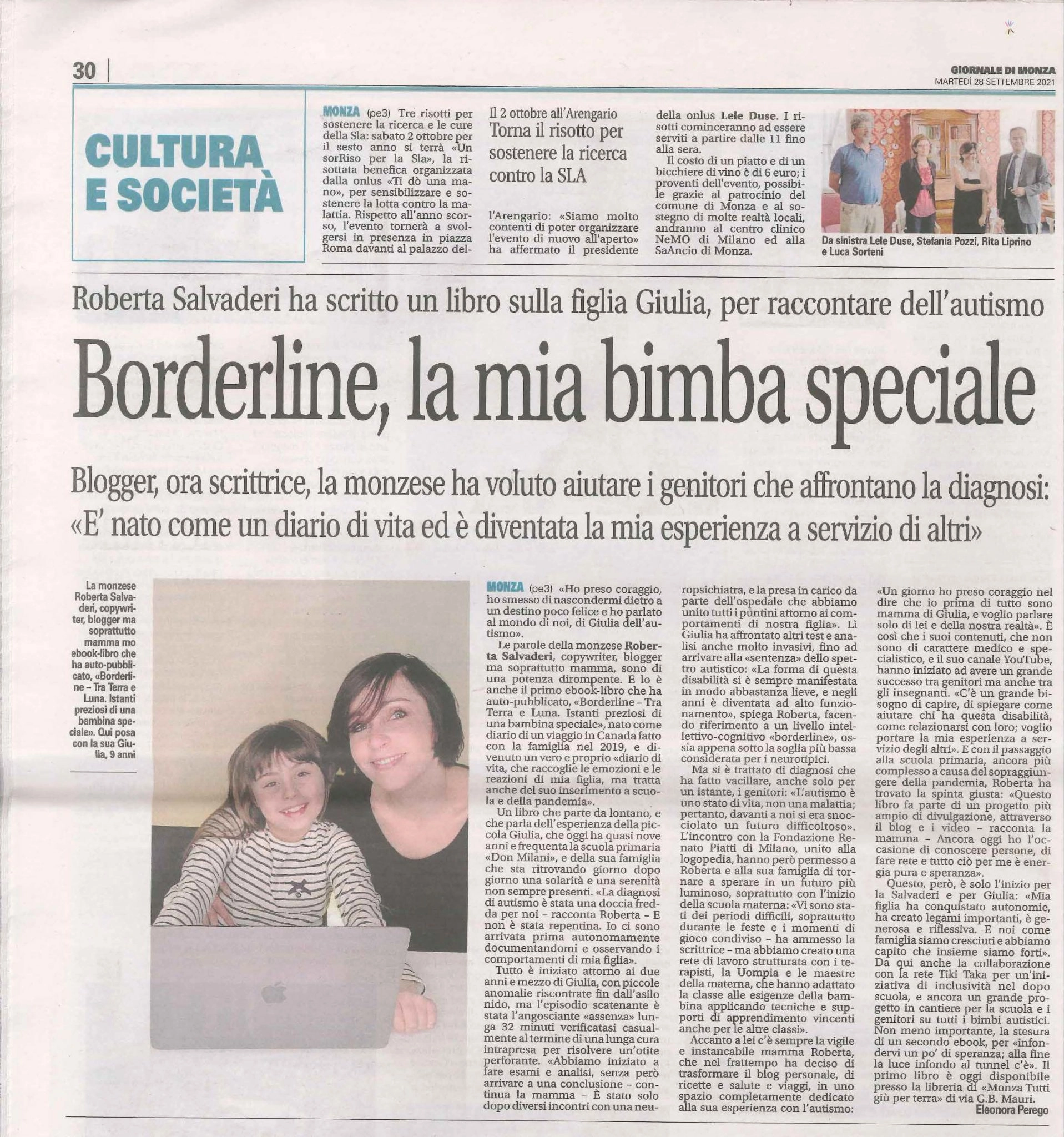 “Borderline: tra Terra e Luna” è il titolo del primo libro scritto da Roberta Salvaderi, mamma di Giulia, una bimba di 8 anni con sindrome dello spettro autistico che frequenta il Centro Autismo di Fon.
